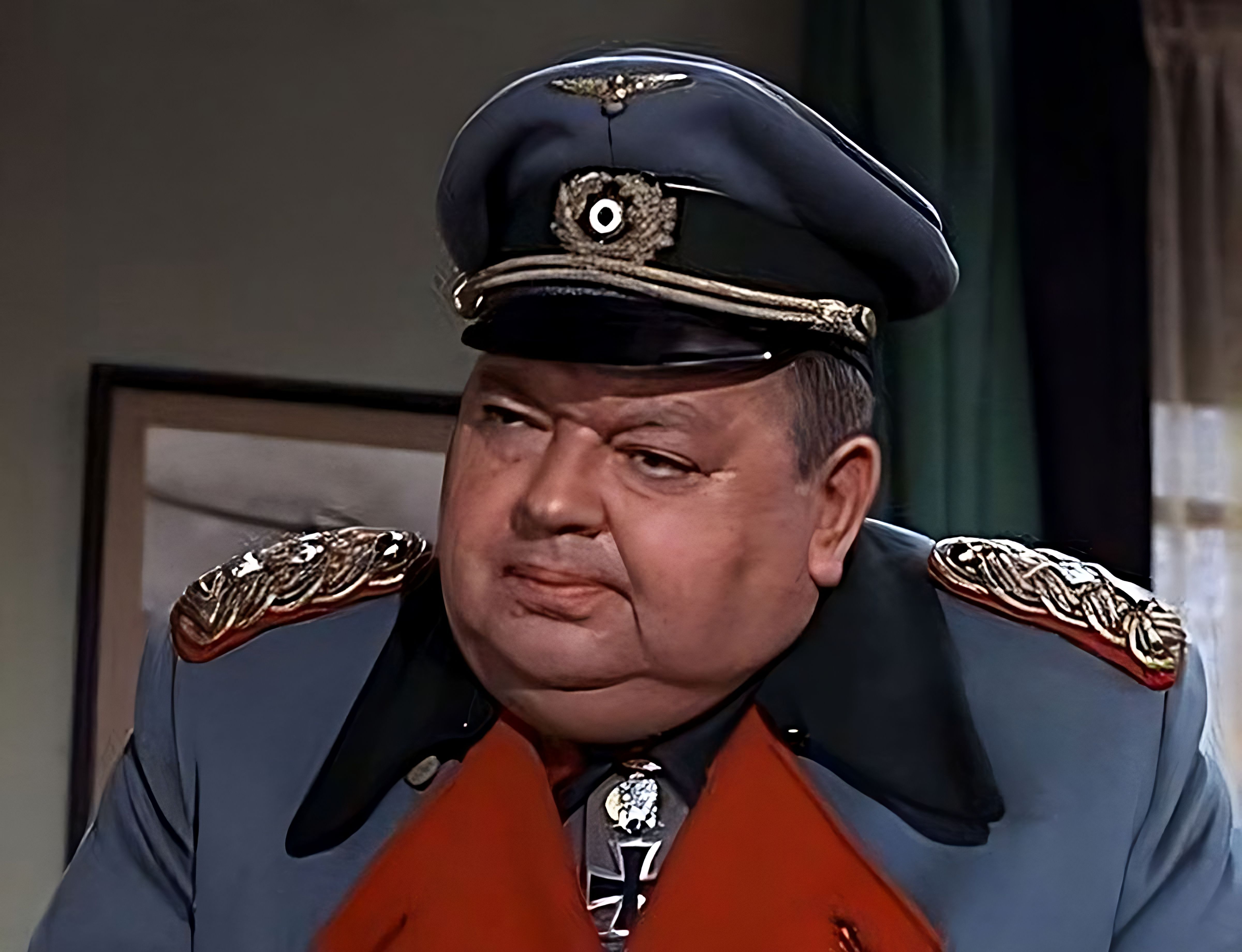 General der Infanterie Albert Burkhalter was born on February 15, 1888 (speculation) in Würzburg, Germany and is Colonel Klink's superior officer. His position as head of the Luft Stalag Organization makes him close to Hitler, even though he is an Army officer, not a Luftwaffe one. There are two reasons for his being an Army General: First, at the beginning of the series he is intended to be a colonel, the aide-de-camp for the Chief of Inspection in Berlin, making him liable to inspect any branch of the armed forces, regardless of his position; second, this was later changed, and he was promoted, because Luftwaffe General uniforms were hard to find in the 1960s. The decorations he wears include the Ritterkreuz, or Knight's Cross of the Iron Cross, with Oak Leaves and Swords; the Iron Cross, 1st Class, with Spange signifying that his Iron Crosses were awarded in WW1 then again in WW2; the Eisenkreuz 2nd Class, a prerequisite for being awarded the 1st Class; the Infantry Assault Badge in Silver(Bronze would be for Mechanized Infantry); the Wound Badge in black(1-2 wounds); and the German Eagle (Deutsche Adlerangriffe) Order, 2nd Class. This last is an unusual declaration for an officer on active regular duty, like him, as it was generally awarded to foreign allies or those sympathetic with the Nazis. It was primarily a diplomatic award. Few Germans were awarded it; three of these were head of the foreign ministry/diplomatic corps von Ribbontrop, Foreign Minister von Neurath, and Reinhard Heydrich, Reichsprotector of Bohemia and Moravia. His ribbons are, like Klink's, made up bars with different colors which actually do not represent any specific awards.