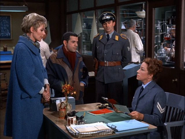 - SPECULATION: The Gestapo officer who appears in this episode also appears at the end of "Color The Luftwaffe Red." He is never named in the series. Given his uniform, apparent position of authority, and the general timeframe, this may be the mysterious Kommandant Heydrich, head of the Hammelburg Gestapo who was killed just before "Everybody Loves A Snowman."