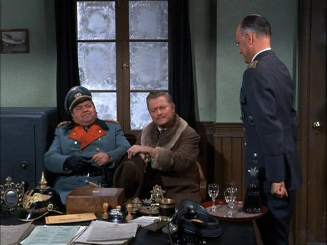 As Hogan is trying to convince Klink that General Burkhalter might be up to something, Helga tells Klink that Burkhalter wants to see him: