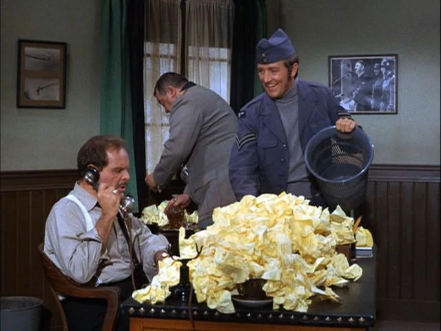 - Captain Gruber makes a brief appearance in this episode, his second in the series. Gruber is played by Dick Wilson, who went on to achieve fame playing Mr. Whipple in over 500 Charmin toilet paper commercials.